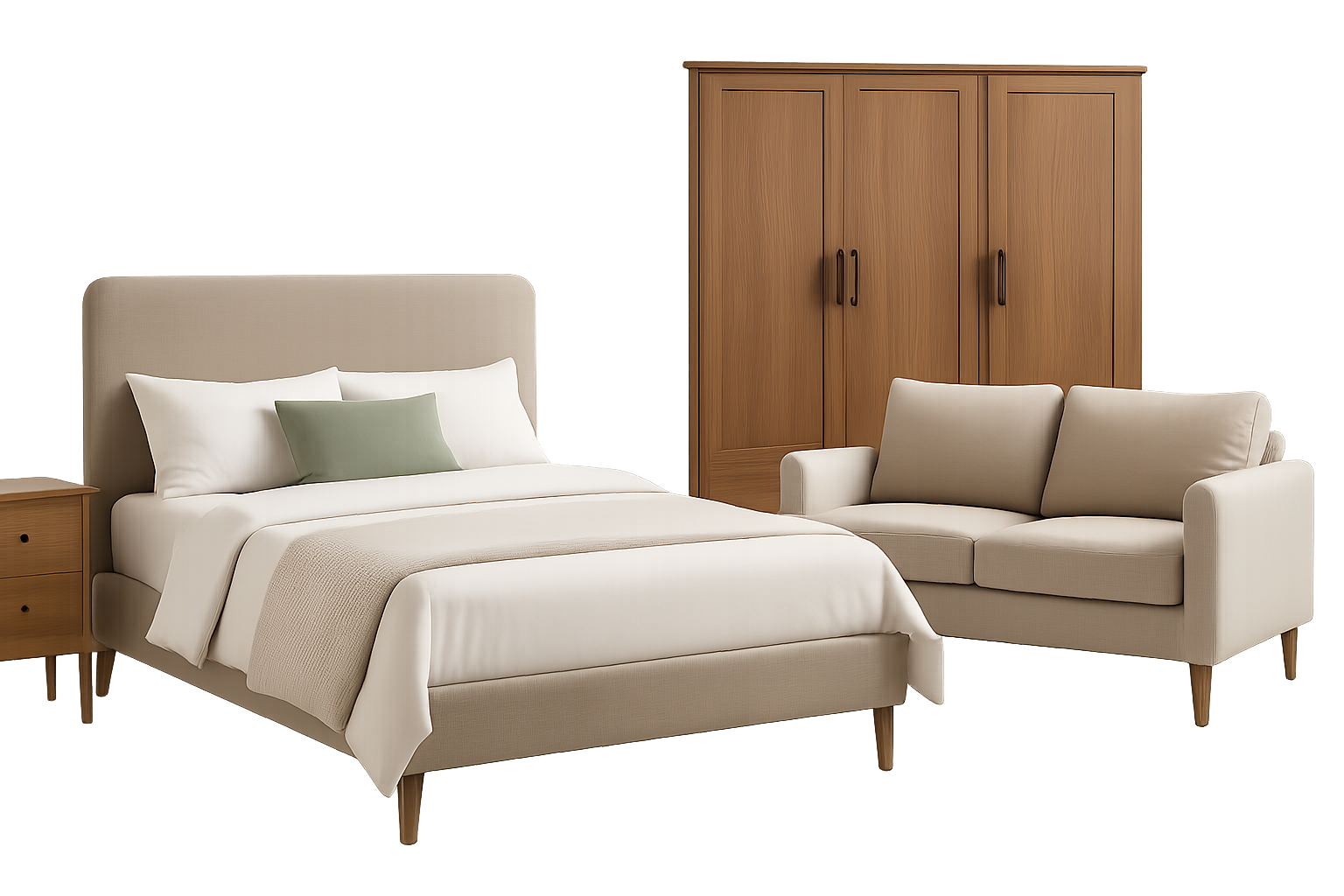 Transform your home with our curated selection of modern and timeless furniture. This collection features a soft beige upholstered bed with clean lines and cozy bedding, a minimalist wooden bedside table, a plush two-seater sofa in a warm neutral tone, and a spacious triple-door wardrobe crafted from natural wood. Each piece blends seamlessly to create a calm and inviting space, perfect for rest and relaxation.