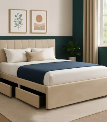 Transform your home with our curated selection of modern and timeless furniture. This collection features a soft beige upholstered bed with clean lines and cozy bedding, a minimalist wooden bedside table, a plush two-seater sofa in a warm neutral tone, and a spacious triple-door wardrobe crafted from natural wood. Each piece blends seamlessly to create a calm and inviting space, perfect for rest and relaxation.
